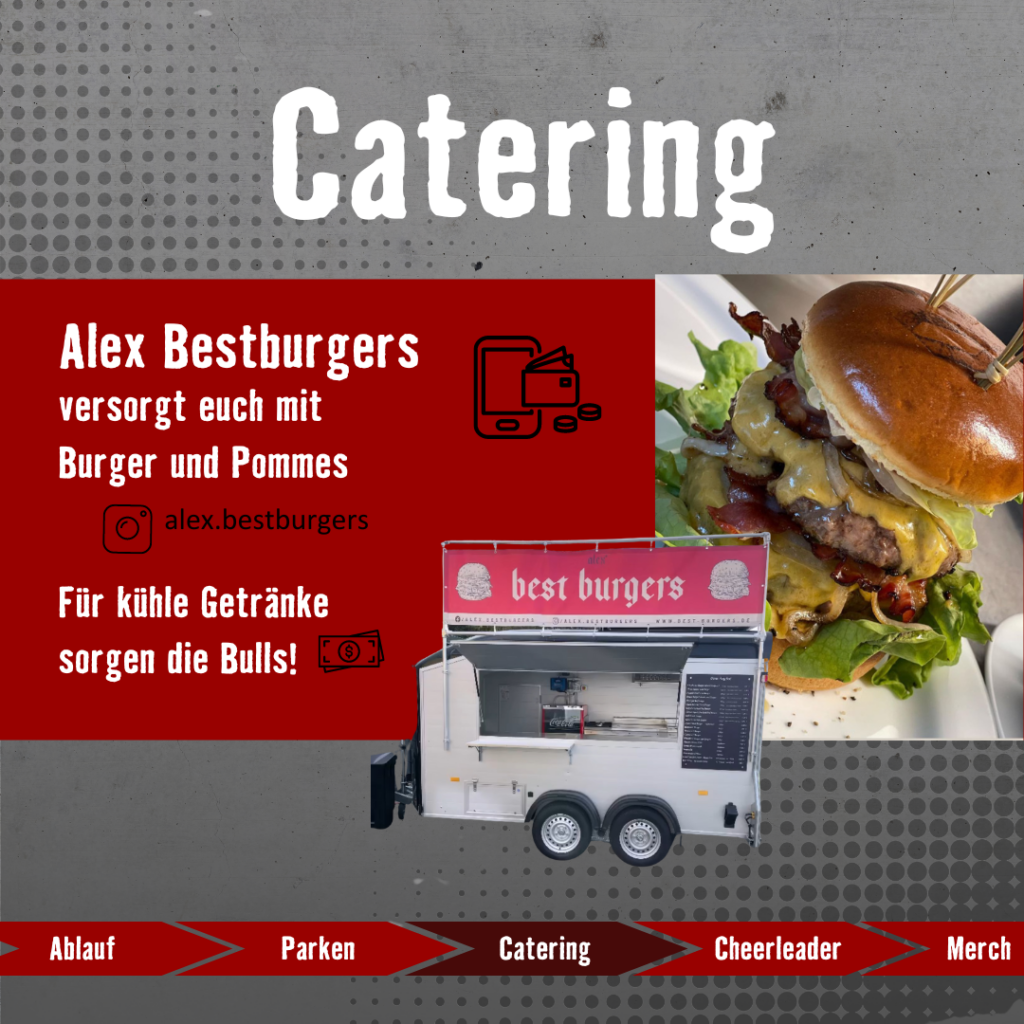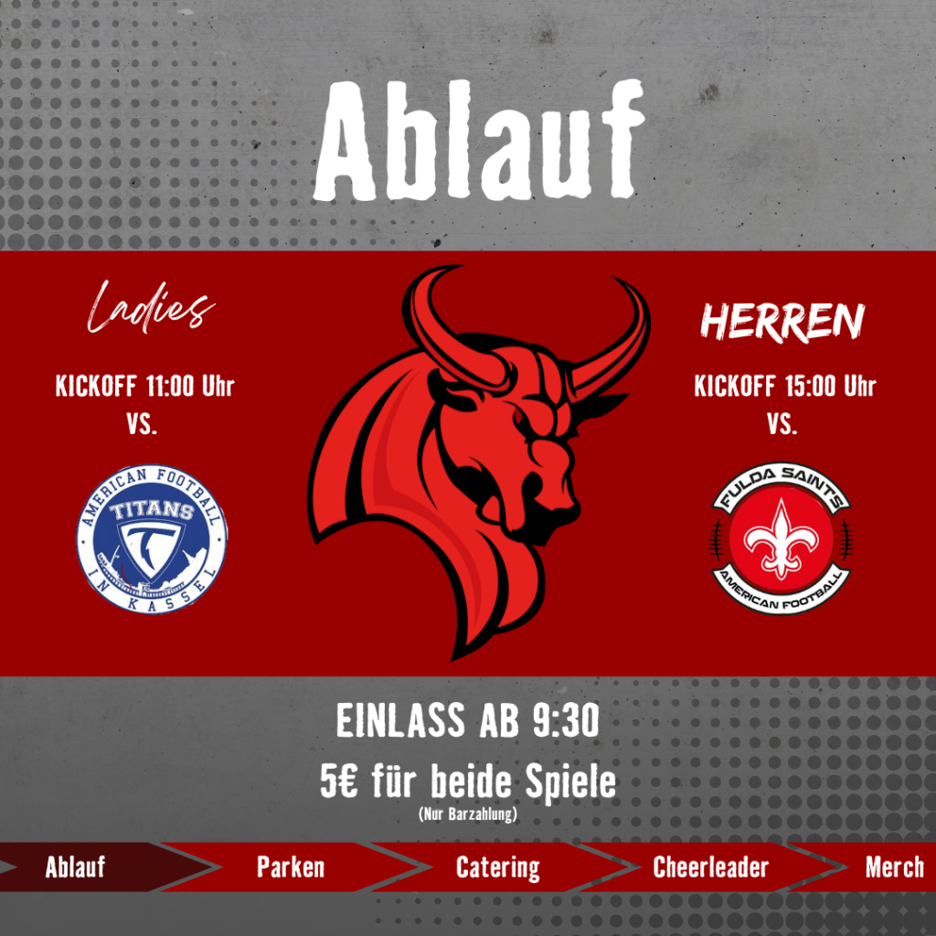 Eintritt für beide Spiele ist 5 Euro. Für das Catering sorgt Alex Bestburgers aus Wölfersheim. Getränke erhaltet Ihr bei uns am Stand. Zudem werden unsere Cheerleaderinnen auftreten und für gute Unterhaltung ist gesorgt.