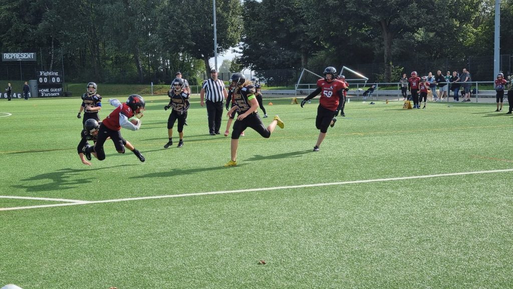 Beim Turnier in Marburg wurde den Bulls U13 Spielerinnen und Spieler vom Quarterback der Marburger die Grenzen aufgezeigt. Gegen Marburg verlor man mit 25:62 und verpasste so den Finaleinzug am 04.11.2023