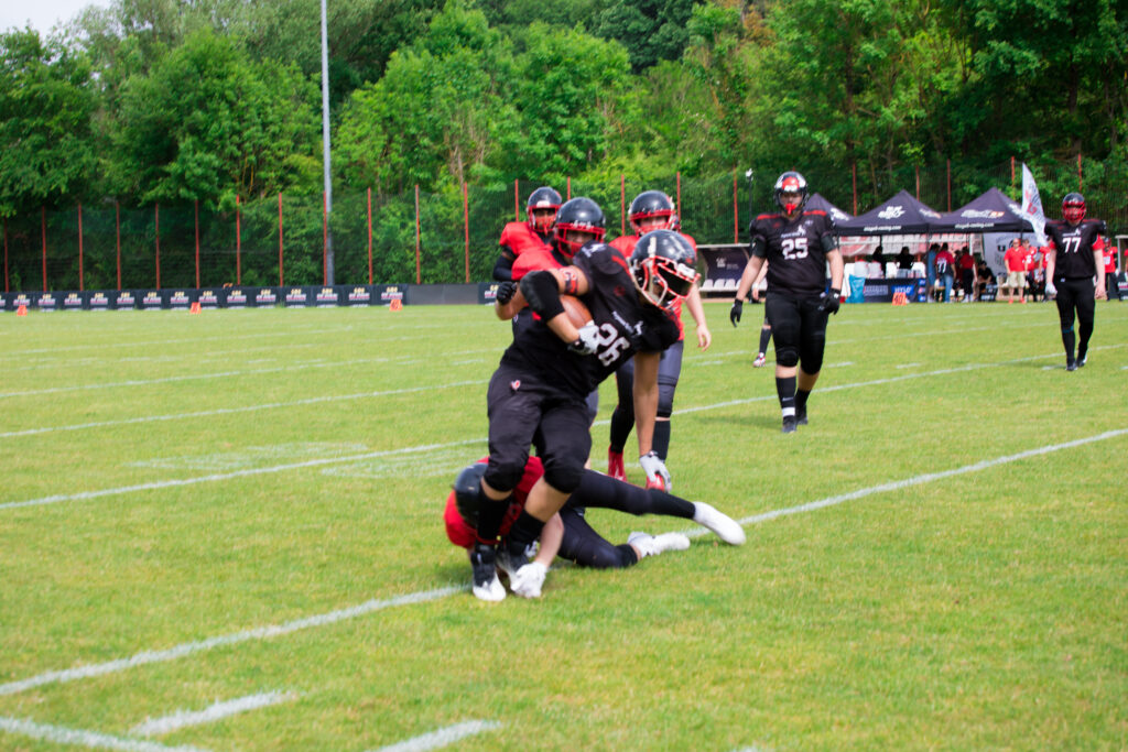 In der zweiten Halbzeit war plötzlich ein ganz anderes Bulls-Team zu sehen. Die Offense begann zu marschieren, zeigte Struktur und Kampfgeist. Kurz vor Spielende stand man sogar kurz davor, einen zweiten Touchdown zu erzielen. Den einzigen Touchdown des Spiels erzielte Johannes Lütkemeier nach einem starken Spielzug. Der Extrapunkt erzielte Christian Strauch. Besonders hervorzuheben: unsere O-Line – kein einziger QB Sack, nur ein einziger schlechter Snap. Zwei Spieler feierten ihr Debüt – Respekt für den Einstieg unter so hoher Belastung.