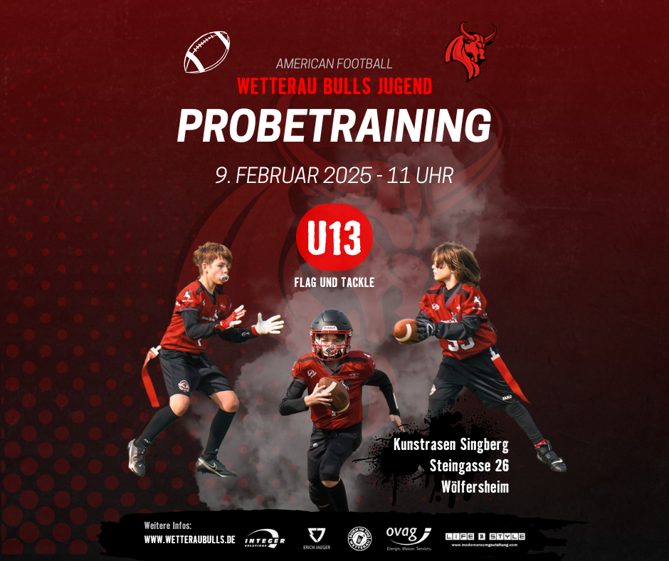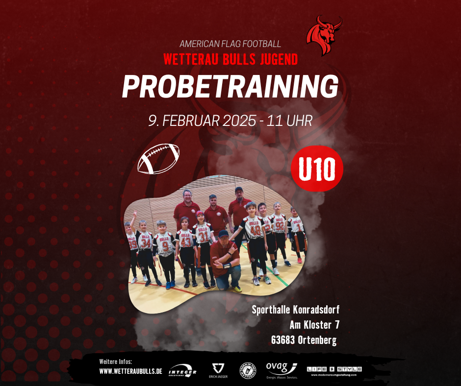 Am 09.02.2025 veranstalten die Bulls in Ortenberg in der Halle der Gesamtschule Konradsdorf ein Öffentliches Probetraining für Kinder unter 10 Jahren. Los geht es um 11 Uhr. Ende ist gegen 13 Uhr. Mitzubringen sind Sportsachen und Sportschuhe.