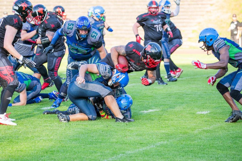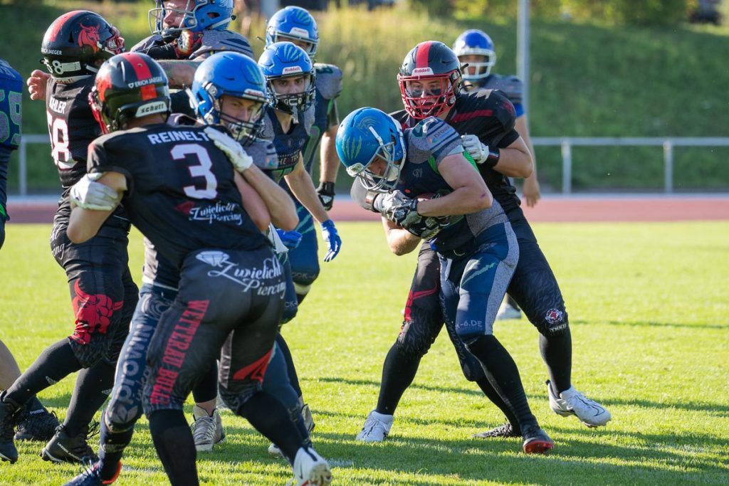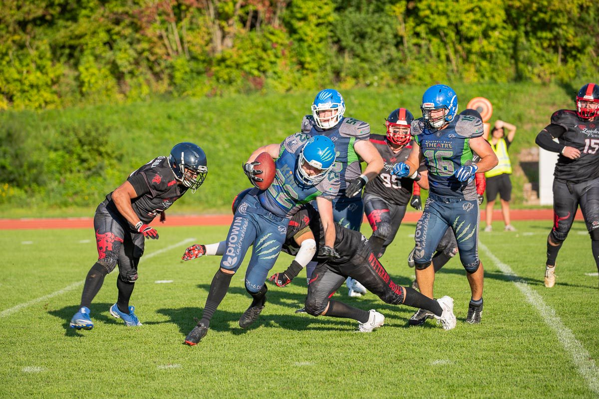 Das Heimteam erhielt jedoch in der ersten Halbzeit mehrfach in aussichtsreicher Position den Ball zurück, um Punkte erzielen zu können. Eine starke Leistung vor allem der Defense Line der Bulls brachte das Heimteam immer wieder in Nöte.