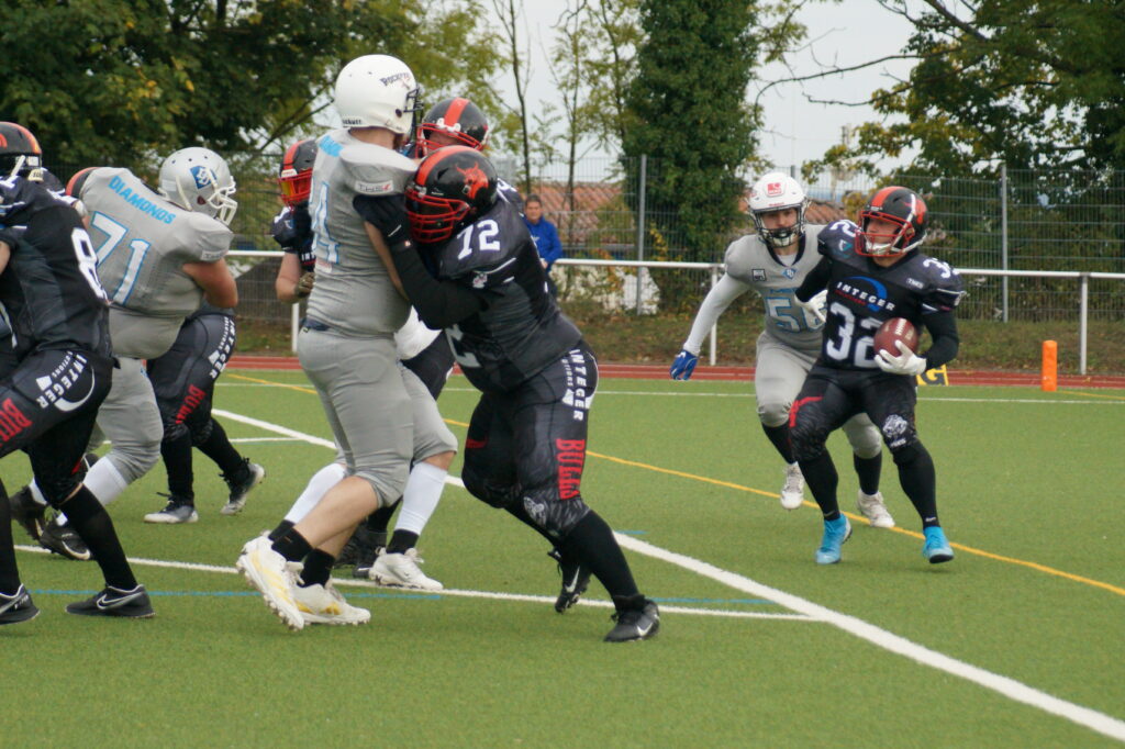 Doch auch die Gäste aus Darmstadt blieben gefährlich und glichen per Touchdown und Two-Point-Conversion zum 8:8 aus. Die Antwort der Bulls ließ nicht lange auf sich warten: Ein Pass von Quarterback Justin Sobot fand erneut Dominic Johnson, der über 70 Yards in die Endzone sprintete. Maurice Hille verwandelte den Extrapunkt sicher – 15:8. Noch vor der Halbzeit kamen die Diamonds mit einem weiteren Touchdown auf 15:14 heran.